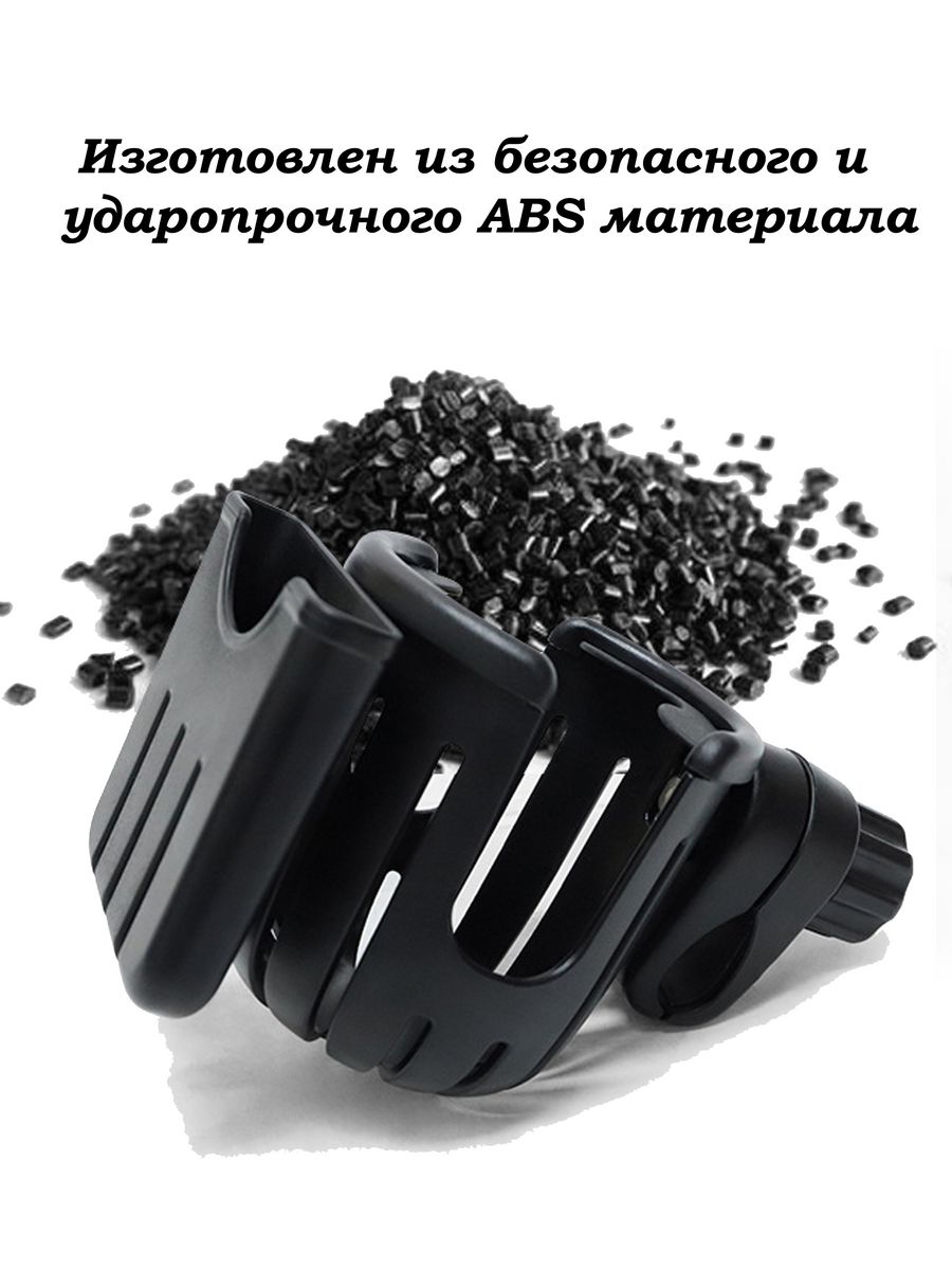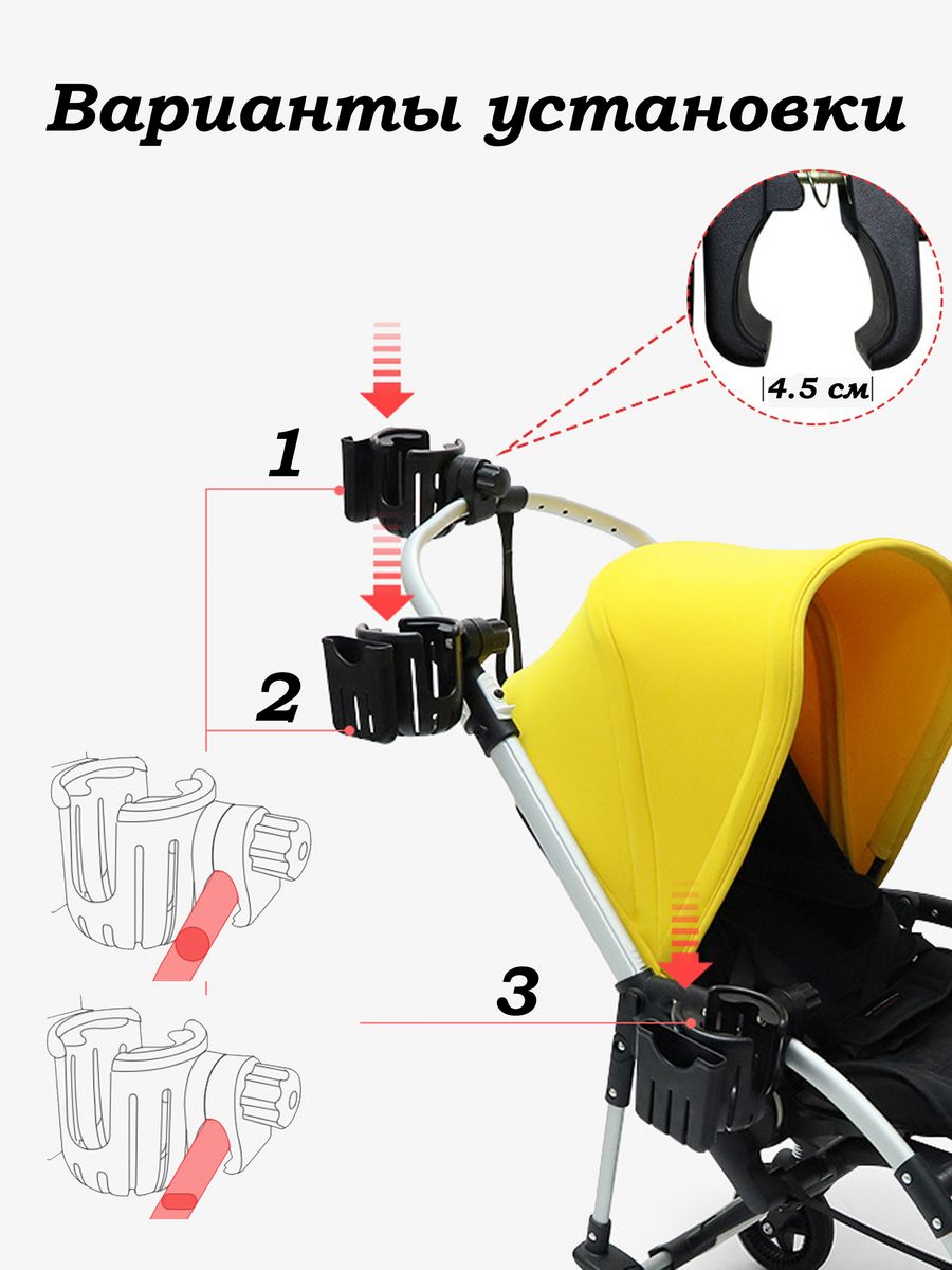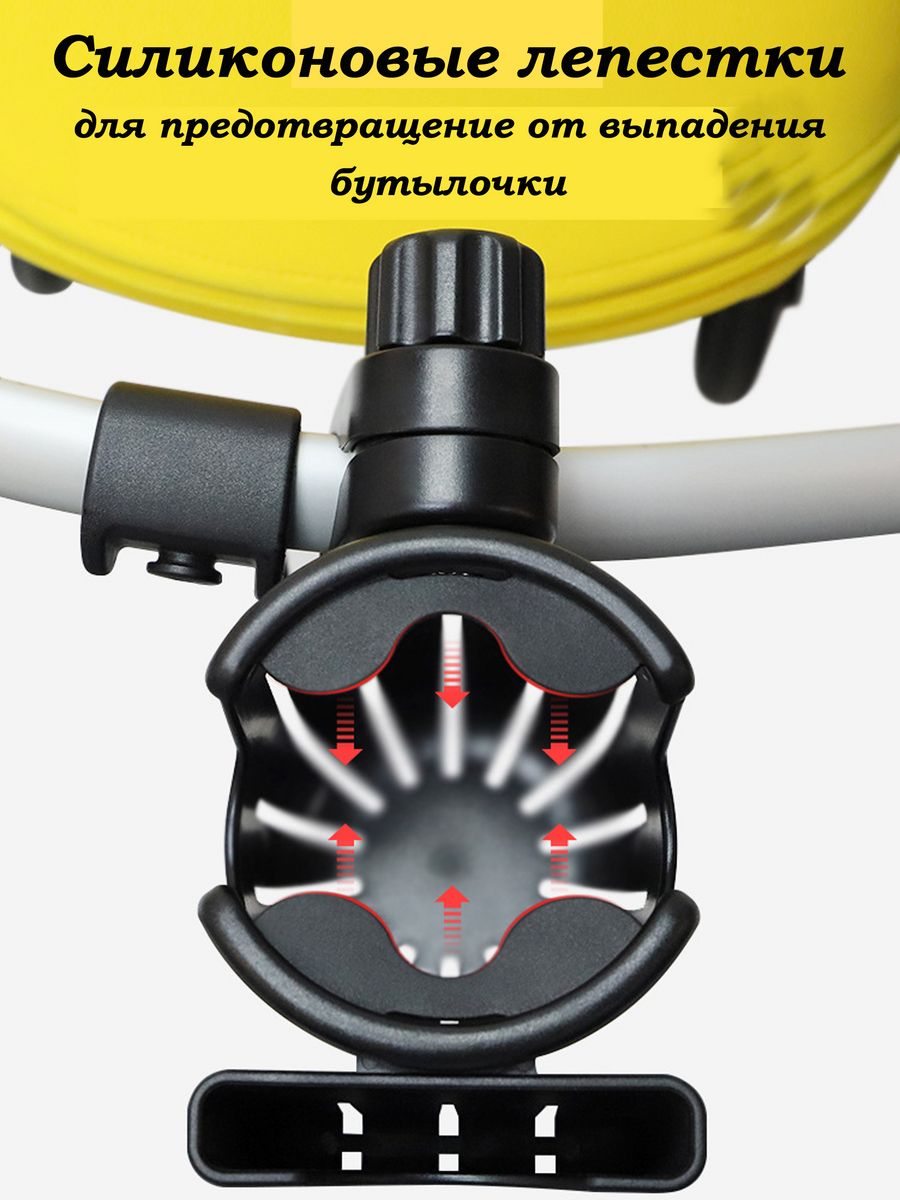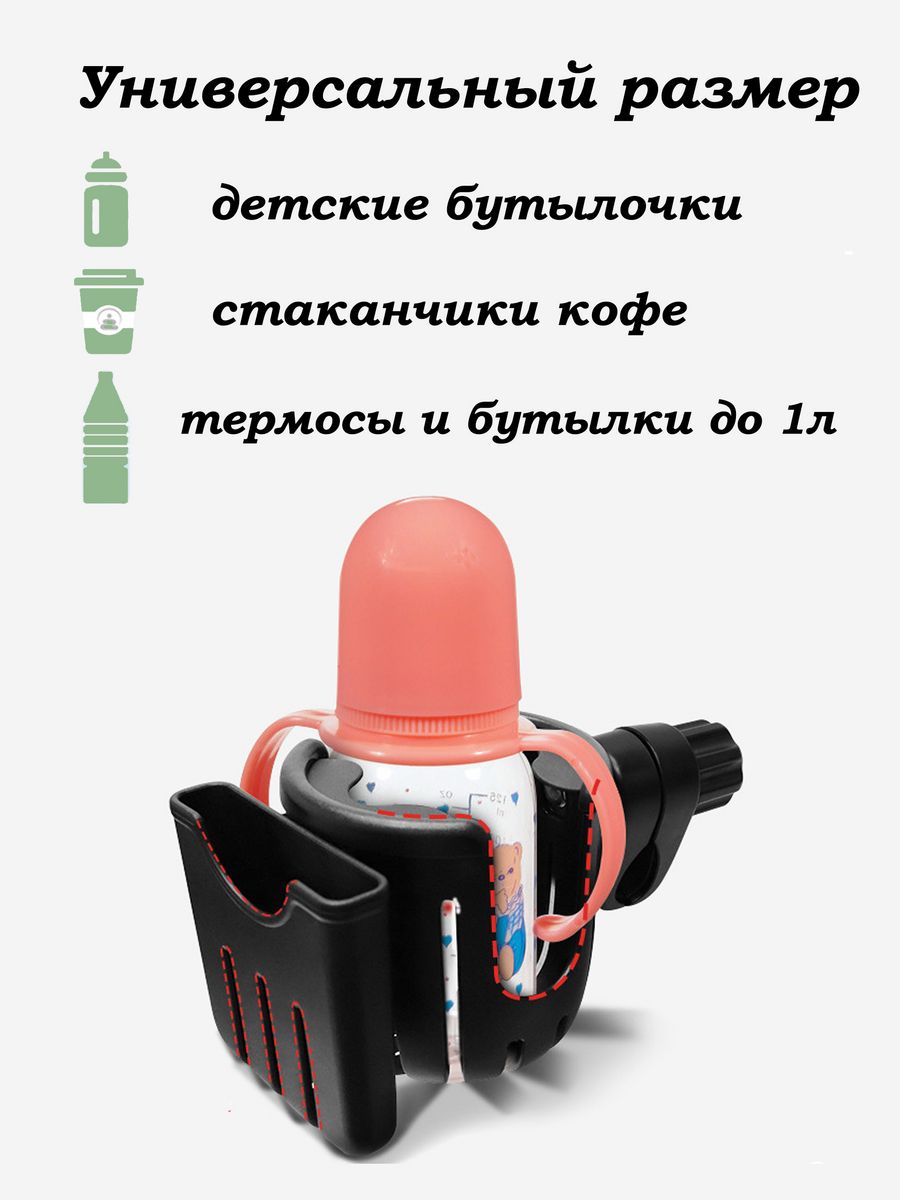 Наш гаджет подставка для бутылки надежно удерживает стакан или бутылку и другие напитки, предотвращая их разлив и падение во время прогулки. Благодаря удобному креплению, аксессуар легко устанавливается и снимается, не мешая при этом перемещению и комфорту малыша.