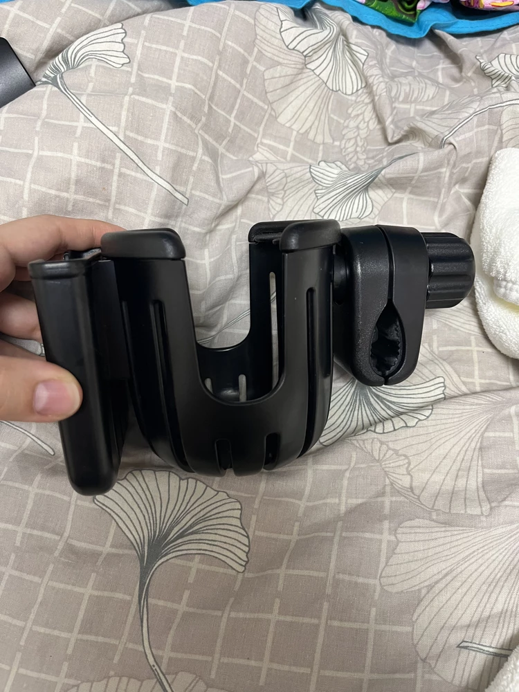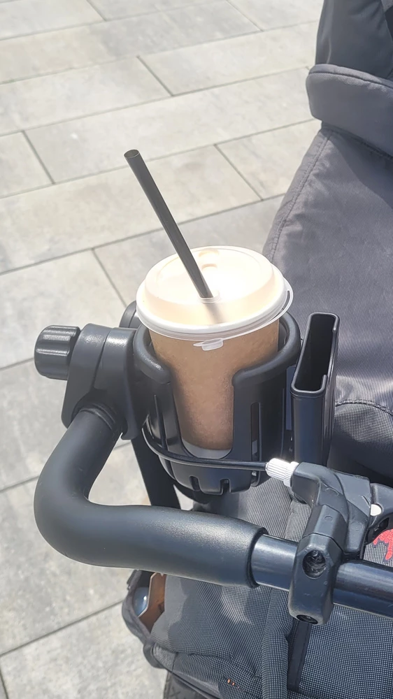 Отличный стакан! Сел плотно на коляску. Бутылочки и стакан помещается отлично. Резиновые ограничитель плотно держат - стакан зафиксирован и не болтается. Телефон влазит. В общем, огонь, рекомендую!